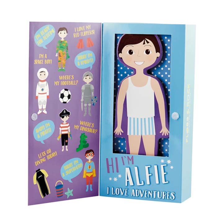 Alfie adora aventuras de ação e pode vestir-se com 7 trajes diferentes, incluindo astronauta, mergulhador, pirata e jogador de futebol. Ele também tem muitos acessórios para cada roupa, incluindo balde, escudo, futebol e um papagaio! Todas as peças são feitas de madeira e são magnéticas. Também é fornecida na fabulosa caixa de exibição um fundo desdobrável com uma cena do quarto de um lado e ao ar livre no verso.