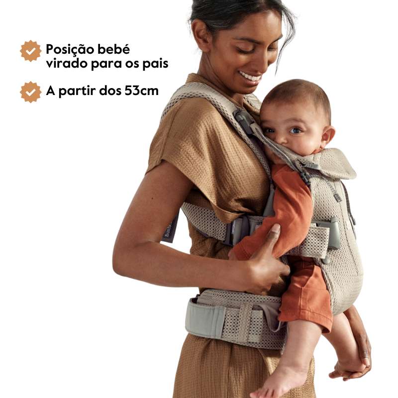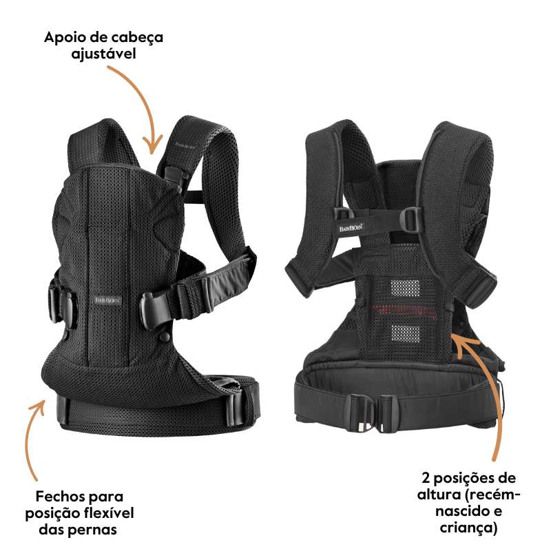 A Mochila Babybjorn One é ergonómica, fabricado em malha 3D e arejada ou em algodão. O cinto robusto e as alças de ombro acolchoadas aliviam a pressão nas costas e nos ombros e tornam possível usar o bebé desde recém-nascido até os três anos de idade.