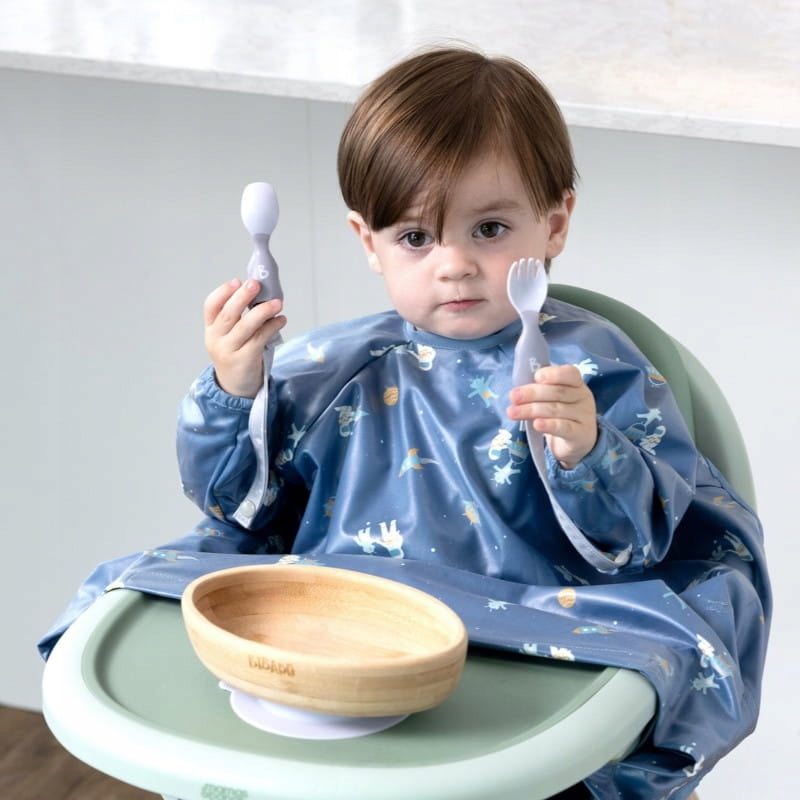 Para bebés a partir da introdução alimentar até aos 36 meses, o Babete com Mangas da Bibado é um essencial!
