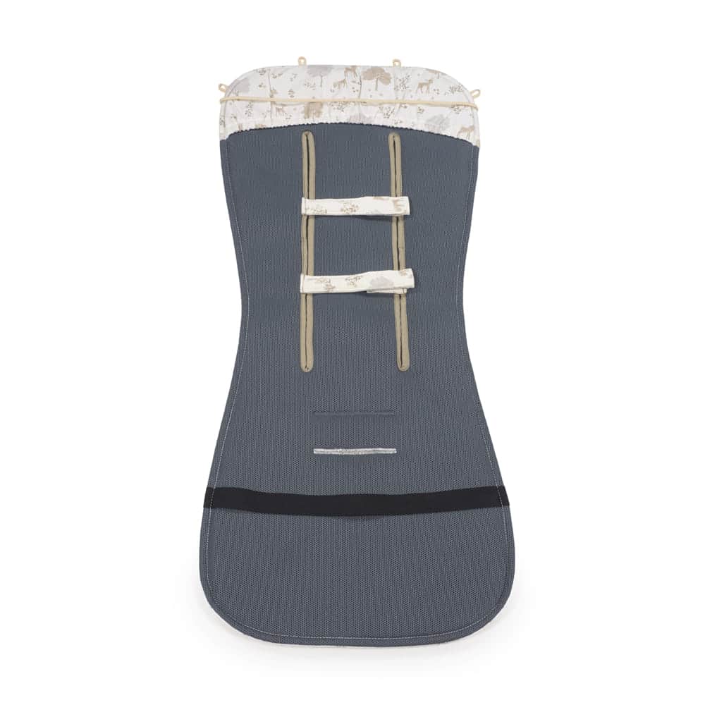 Este modelo está pensado para se adaptar à maioria das cadeiras de passeio, pois dispõe de várias aberturas (ilhos) e ajustes para cobrir a superfície onde o bebé se recosta. Acabamentos de qualidade.