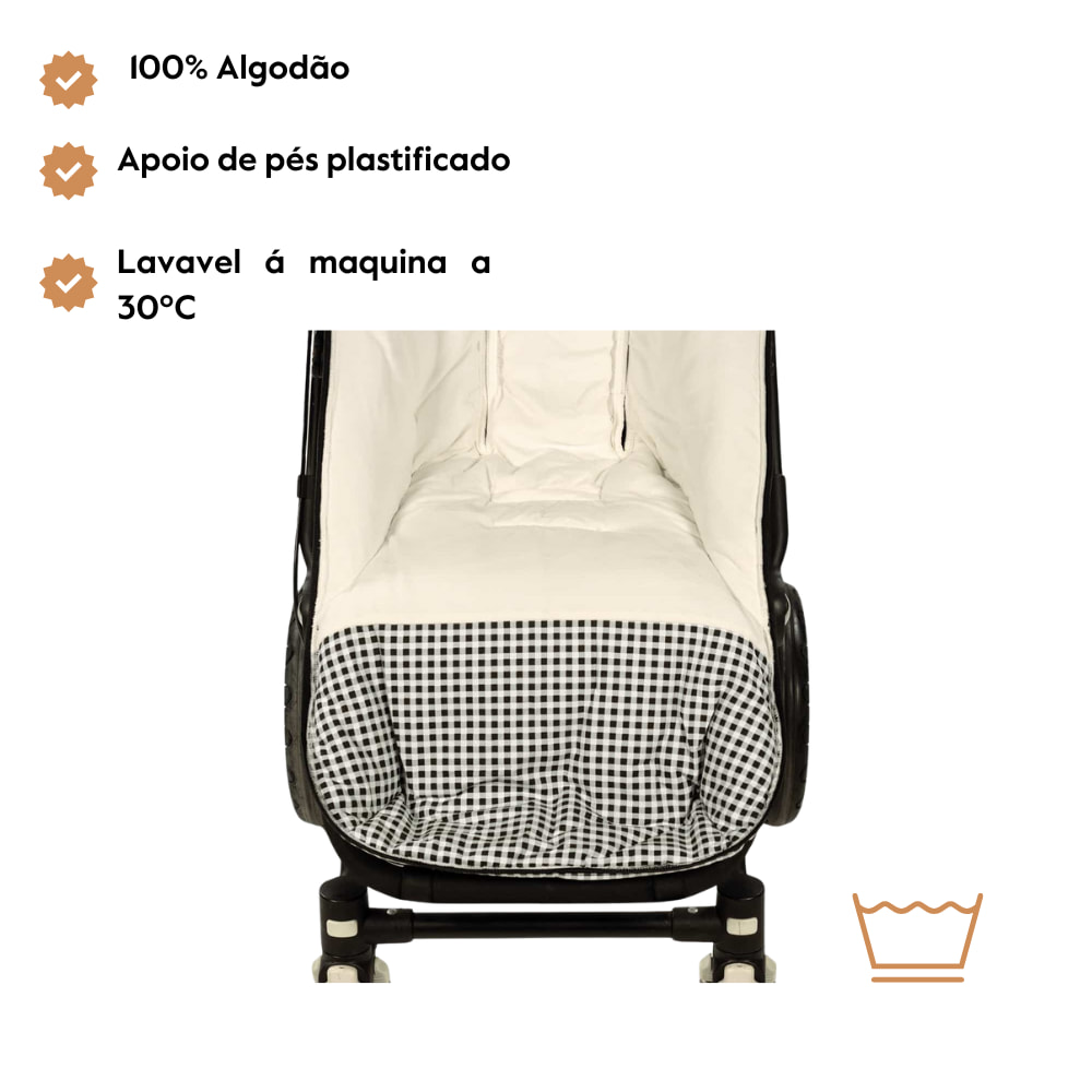 Com um design que incorpora várias aberturas (ilhos) e ajustes, a instalação é fácil e a adaptação à maioria dos carrinhos é garantida. Confeccionada com um material resistente e quente, cria um verdadeiro ninho acolhedor para o seu bebé. Possui uma base plastificada no apoio para os pés, facilitando a limpeza após o uso e prevenindo a acumulação de sujidade. O saco adapta-se perfeitamente, permitindo que o bebé desfrute de um descanso mais agradável.