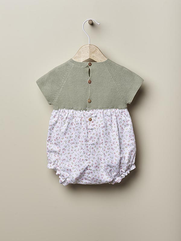Fofo de manga curta com estampa floral, ideal para bebés, até os 18 meses. A parte superior do fofo é delicadamente tricotada em malha fina verde de algodão orgânico, destacando um botão decorativo da marca na frente. A parte inferior é confecionada em tecido de algodão suave, com um charmoso padrão floral sobre fundo pérola, forrado com algodão leve para proporcionar maior conforto. Este macacão fecha nas costas e entre as pernas com botões de madeira. Produzido com a tecnologia Wholegarment, esta é uma peça completa e sem costuras visíveis, garantindo o máximo conforto para o seu bebé.